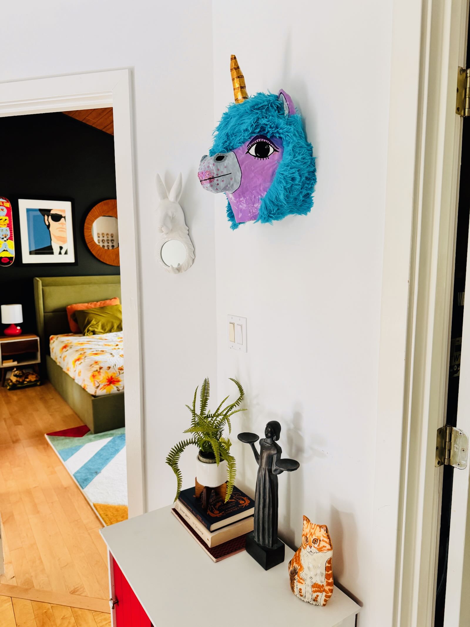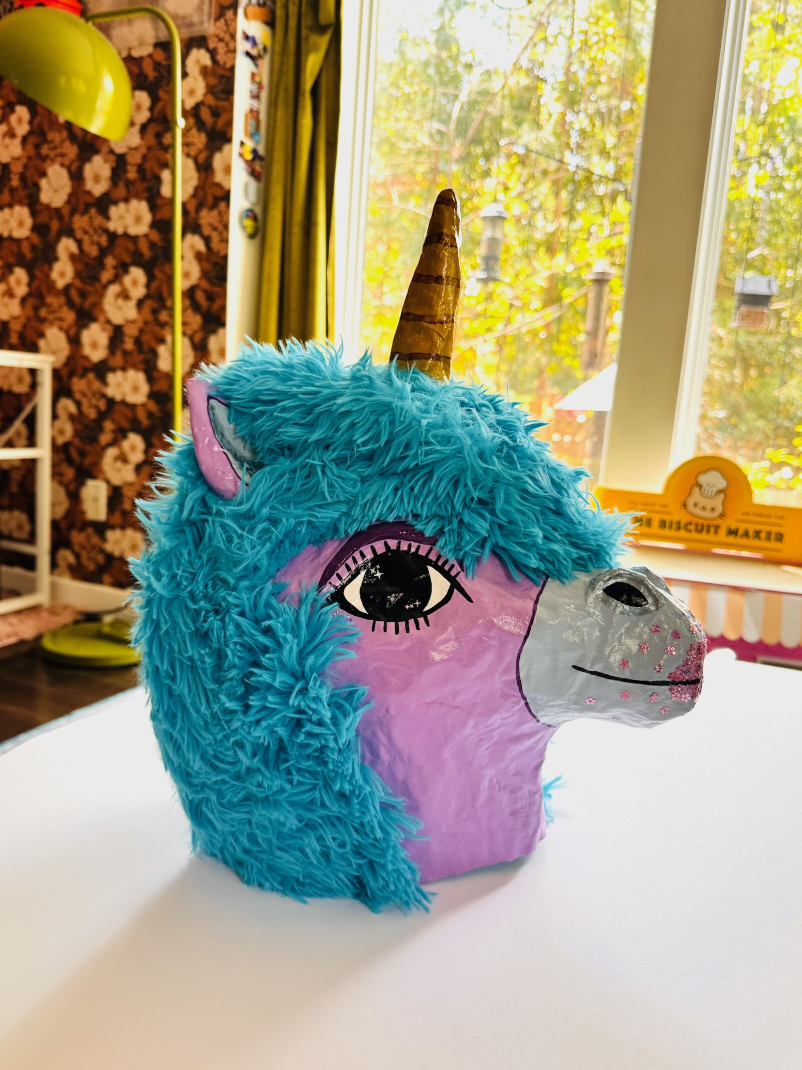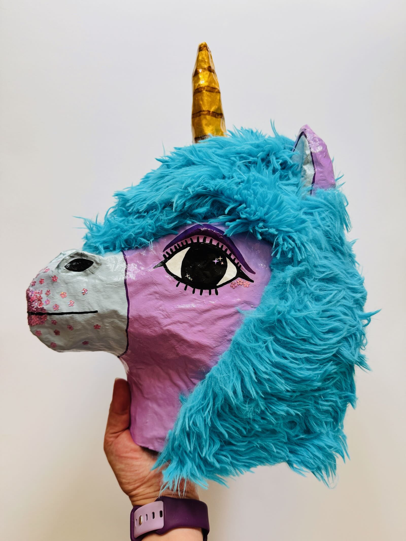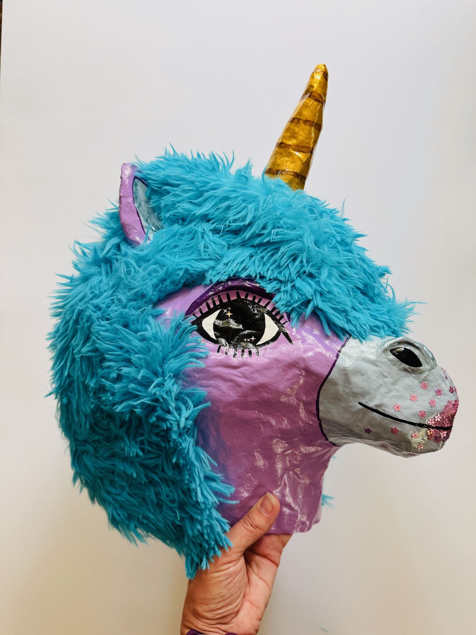 What is it: A paper-mache wall hanging of a unicorn head. Ready to hang (clay hanger built into the back, will need screw or very long, secure nail). Approximately 10″ wide and 15.5″ tall.