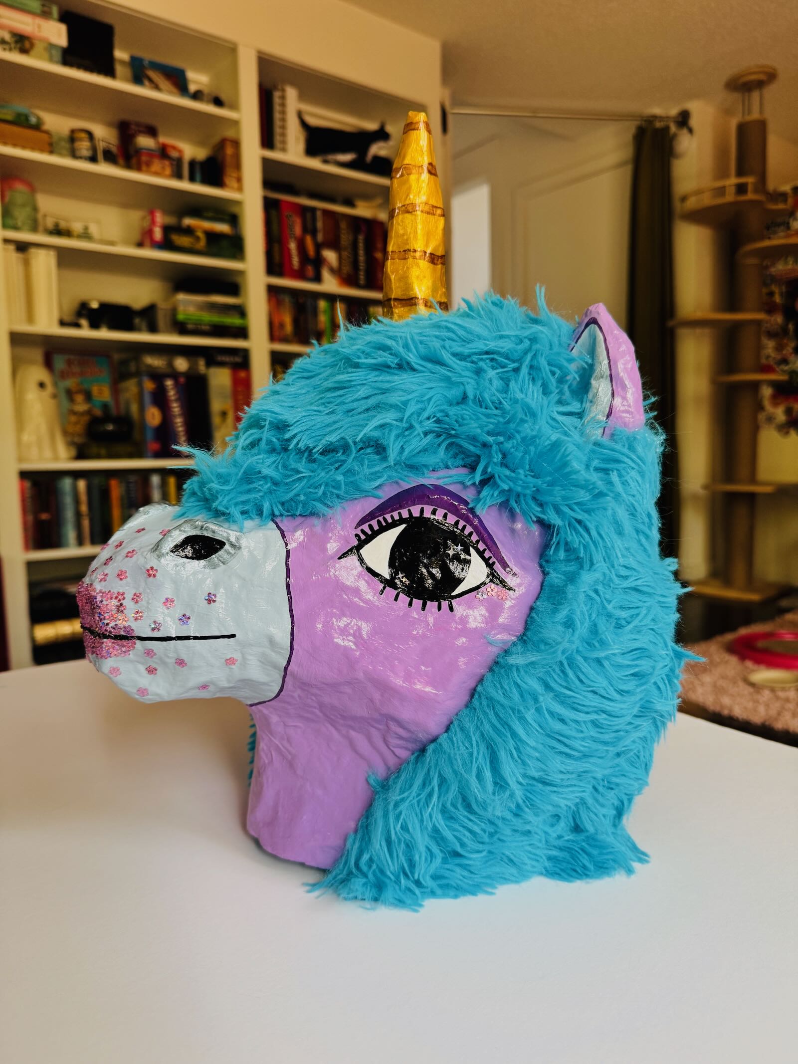 This is a paper-mache sculpture, handmade by me. All my sculptures are one-of-a-kind and contain little imperfections and an attitude of their own. Guaranteed 100% to not make you cry like The Last Unicorn did. Thanks for supporting a small artist and helping to feed my cats.